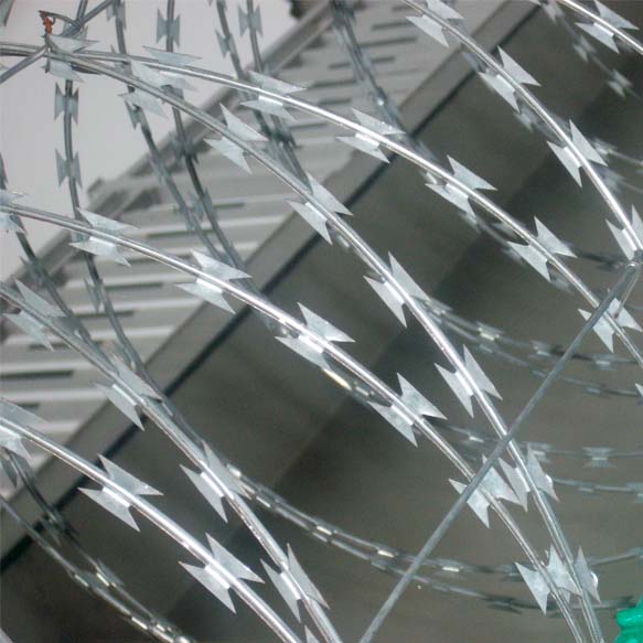 鍍、熱鍍。 編織特點: 擰編而成;牢固、美觀; 產(chǎn)品特點:監(jiān)獄防護(hù)網(wǎng)具有防腐、防老化、抗曬、耐候等特點。螺旋型交叉刀片刺網(wǎng)是在