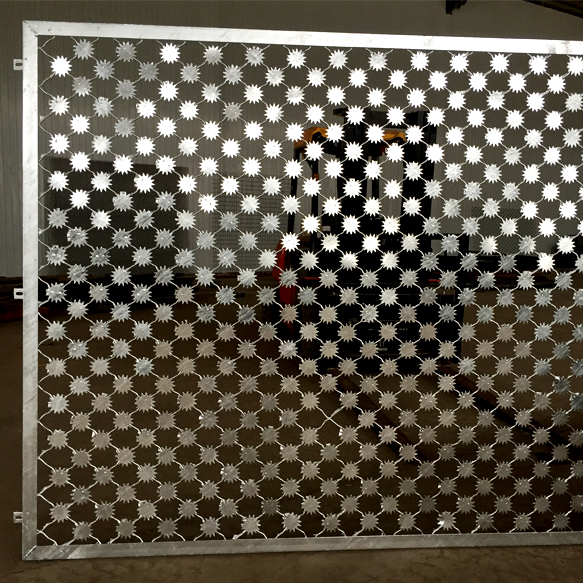 1、 梅花刺片護(hù)欄網(wǎng) 又名太陽花刺片隔離網(wǎng),為單層梅花刺片網(wǎng),直徑不小于75cm,刺片厚1.5mm,采用Q 235低碳鋼板沖壓成型。 2、網(wǎng)片為菱形網(wǎng)孔,網(wǎng)格尺寸∶120mm*110mm(…