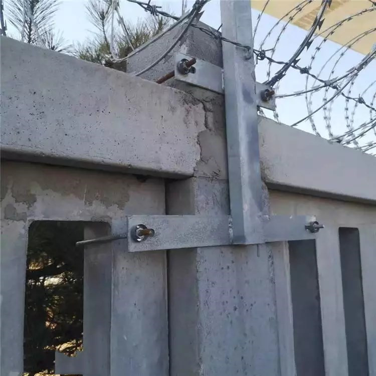 刺絲滾籠與支架連接:刺絲滾籠由刺絲連接卡扣與固定在支架上的縱向拉筋相連接。縱向拉筋與支架的連接采用Φ2.5mm的冷拔鍍鋅鋼絲繞2圈后擰緊固定。支架設置在跨度3m防護柵欄的立柱和跨中位置,其中跨度進設置與立柱上部, 支架與防護柵欄采用支架抱箍連接,對于已經(jīng)安裝金屬網(wǎng)片的防護柵欄。刺絲滾籠直接采用Φ2.5mm的冷拔鍍鋅鋼絲或刺絲連接卡扣固定于金屬網(wǎng)橫片和金屬絲上。