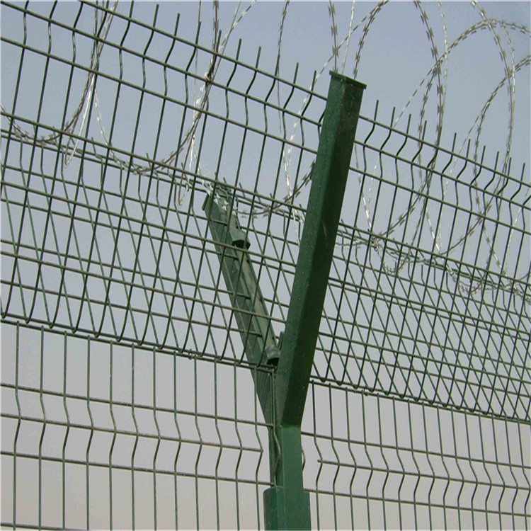 現(xiàn)在人們選擇飛機(jī)出行的方式越來越多,當(dāng)看到這種高大護(hù)欄網(wǎng)時(shí)不知是如何生產(chǎn)的,這種護(hù)欄網(wǎng)是采用大直徑高強(qiáng)度合金鋼絲制作。機(jī)場護(hù)欄網(wǎng)主要是采用高強(qiáng)度的刀片刺網(wǎng)與普通防護(hù)網(wǎng)的結(jié)合,由V型支架立拄,加強(qiáng)型焊接片網(wǎng),安全防盜連接件組成。
