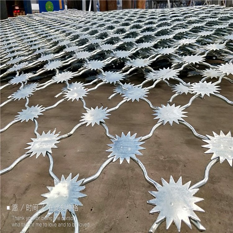 1、梅花刺片隔離網為單層梅花刺片網,直徑不小于7.5cm,刺片厚1.5mm,采用Q235低碳鋼板沖壓成型。