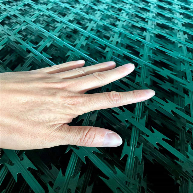 焊接刀刺網是把刀片刺絲焊接成菱形孔或者方形孔的刺網,如果有人想攀爬翻越,網狀的刀片刺絲刀片鋒利,手不能握,腳不能攀登,堅決阻止人逾越的防護墻,具有很強的恐嚇和阻止效果,既美觀又實際效果顯著.