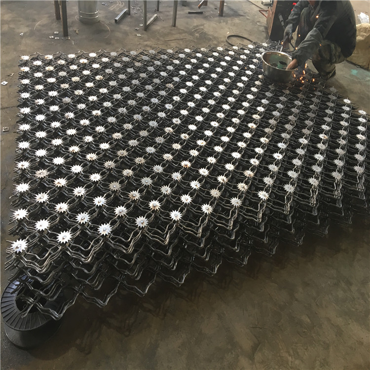 梅花刺片:梅花刺片直徑不小于7.5cm(直徑6cm、7cm、8cm),刺片厚1.5mm,采用Q235低碳鋼板沖壓成型。梅花刺片用氬弧焊將梅花形刺片焊接在美格網(wǎng)的節(jié)點(diǎn)上,形成刺形保護(hù),有效的防止了手握腳攀。