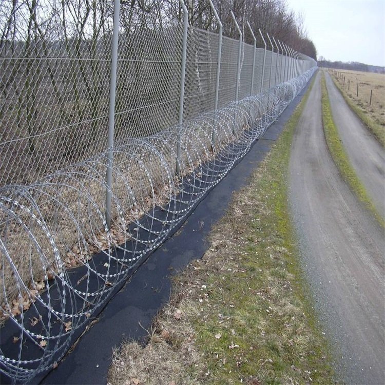 3、鍍鋅刺刀圈材料及安裝技術(shù)要求:鍍鋅刺刀圈材料:常用刀片刺網(wǎng)規(guī)格為BTO-22,刺圈直徑500mm,刀片長度22mm,刀片寬度15mm,刀片間距34mm,鍍鋅噴塑。鍍鋅刺刀圈規(guī)格為雙股2mm鐵絲捻扎而成,刺結(jié)間距102mm,鍍鋅防腐。鍍鋅刺刀圈安裝應(yīng)控制在每米圍界范圍內(nèi)有5個(gè)刺圈,即刺圈安裝間距20Omm,要求刀刺圈間距均勻,上下口平直。刺刀圈固定件為專用卡扣,使用專用工具固定在鋼圍界刺繩上,卡扣不得有松動(dòng)現(xiàn)象,保證刺網(wǎng)安裝牢固。