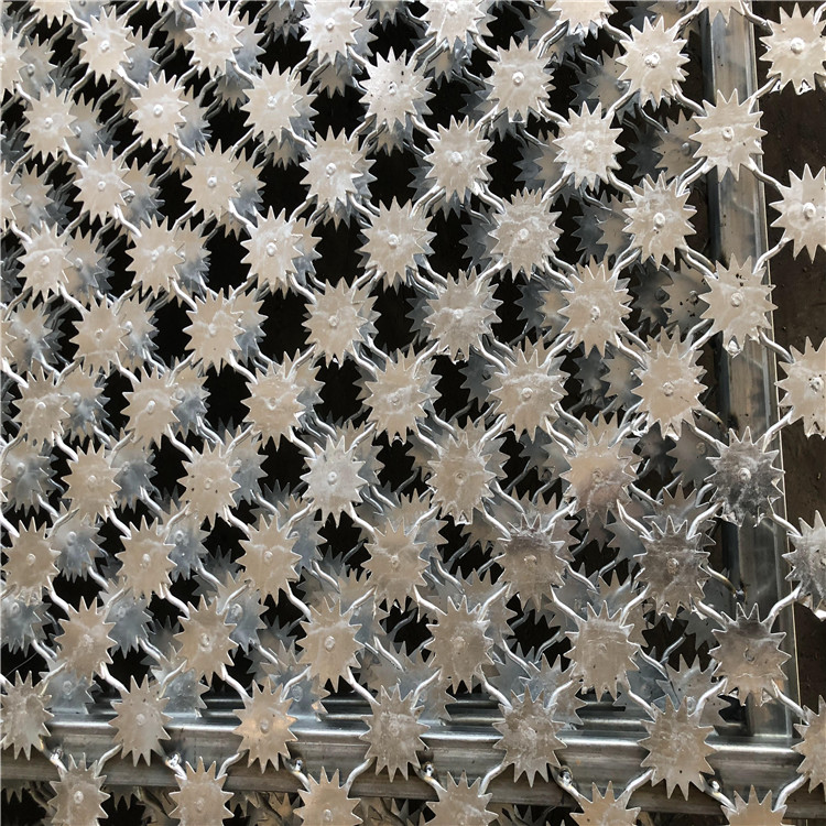 1、梅花刺片護欄網(wǎng)又名太陽花刺片隔離網(wǎng),為太陽的后商單層梅花刺片網(wǎng),直徑不小于7.5cm,刺片厚1.5mm,采用Q235低碳鋼板沖壓成型。