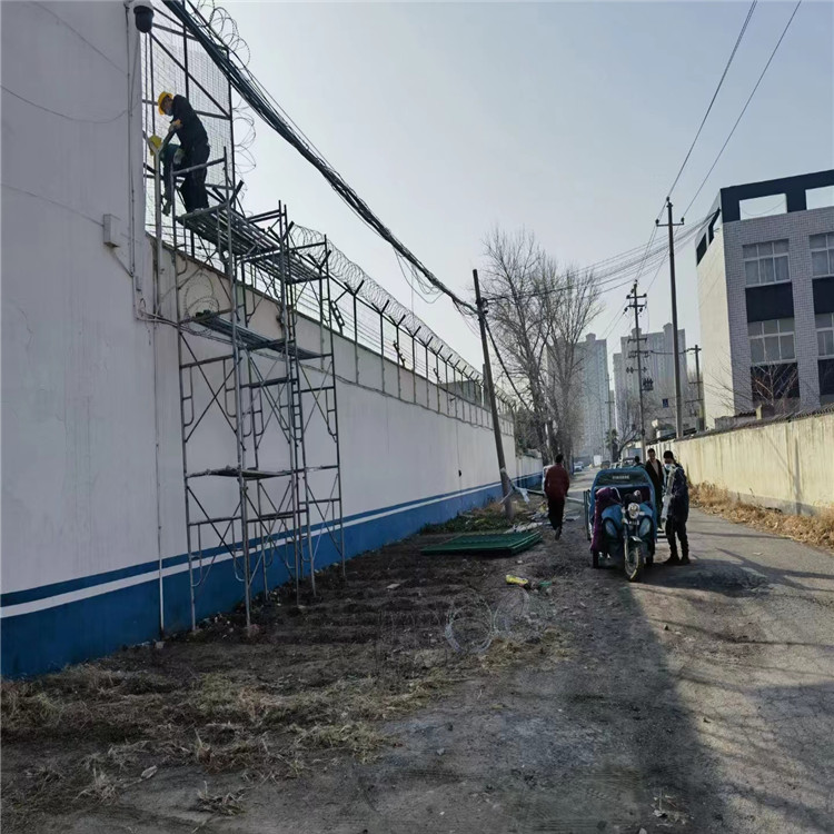 全防護設施,由焊接鋼網加蛇腹形刀刺網組合而成。監獄防攀爬護欄網具有結構新穎、堅固緊密、網面平整、 網孔均勻、鋒銳利、防攀爬、抗腐蝕性強等特點。建設于監獄的內外墻地面及高墻之上, 網墻內側或頂部加裝蛇腹形刀刺網,形成-道高不可攀、難以逾越的隔離障礙。配合高壓打擊電網、各種監控報警設備確保監獄安全萬無一失。