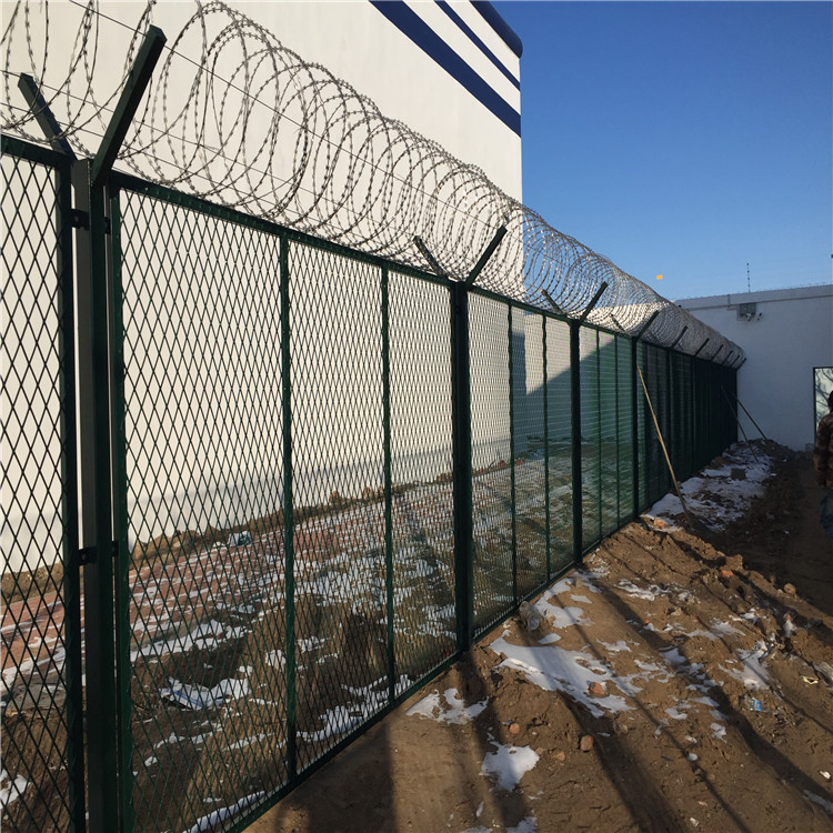 頂部結構:這是最關鍵的部分。通常設有向內或向外傾斜的蛇腹形刀刺網,或呈“Y”形的防攀爬倒刺柵欄。這是最有效的物理和心理威懾。