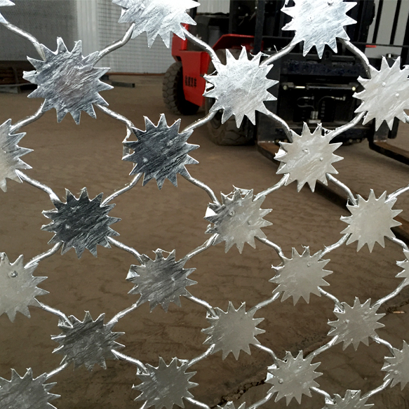 2、網片為菱形網孔,網格尺寸∶120mm*110mm(高*寬),網絲直徑8mm,采用S195線材高壓焊接,每一個焊點附焊梅花刺一個。