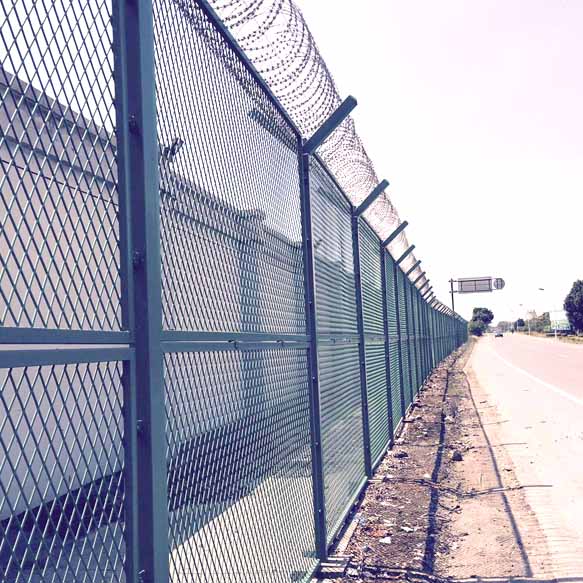 年來,被廣泛應(yīng)用在機(jī)場,軍事基地等高安全場所.注:如果在機(jī)場護(hù)欄網(wǎng)頂部加裝刀片刺絲,刀片刺繩后又很好的增強(qiáng)了安全防護(hù)性能.采用